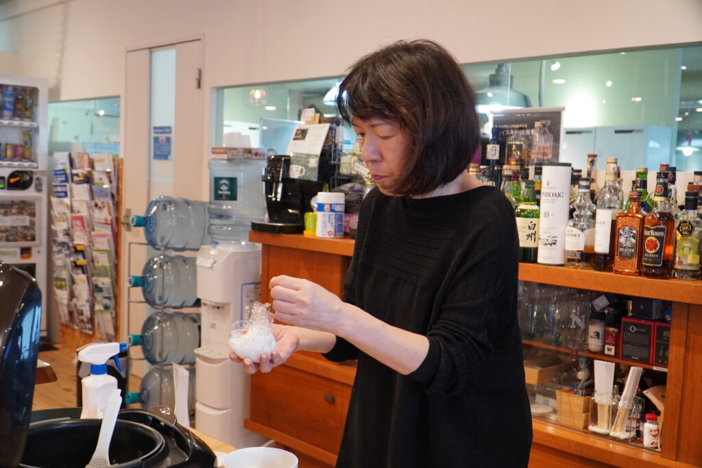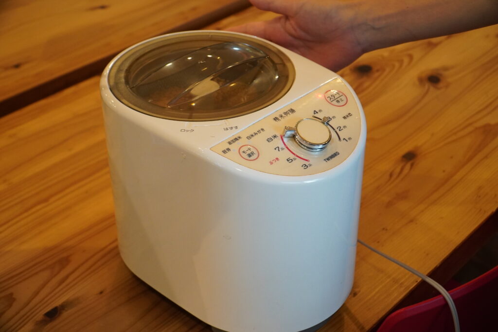 玄米から精米したてのお米はよりおいしいとのことで、井上さんに精米器を貸していただき、その場で玄米から白米に精米しました。