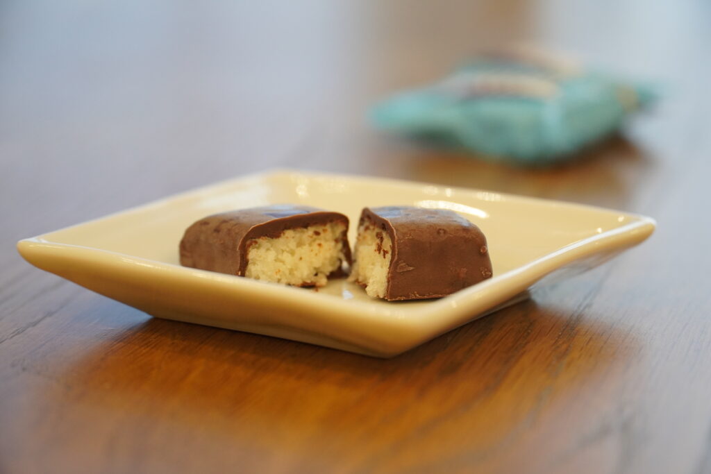 細かいココナッツがバーの中に詰まっていて、かじったときにふわっとぎゅっとした食感が楽しい逸品。シャリシャリのココナッツと甘さ控えめのダークチョコレートがとてもマッチしていておいしいです。