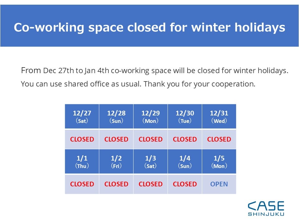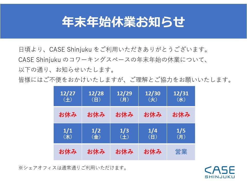 シェアオフィス&コワーキングスペース CASE Shinjukuでは、下記のとおりコワーキングスペースの営業をお休みさせていただきます。