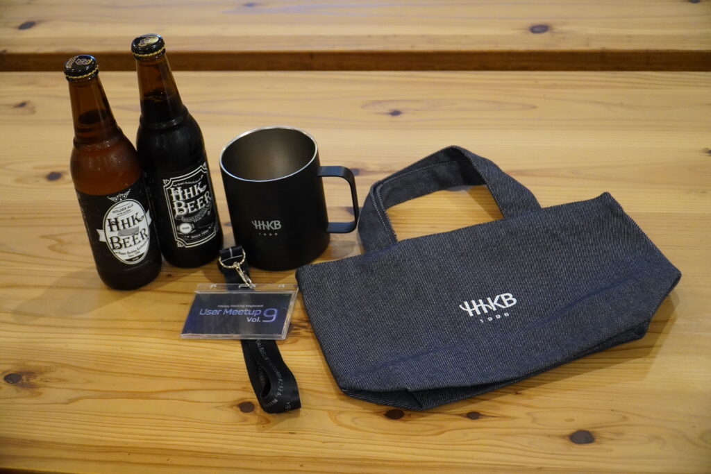 HHKBEER(ビール)が2本、マグカップ、ミニトートバッグをいただきました。