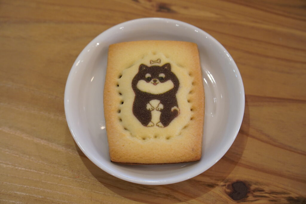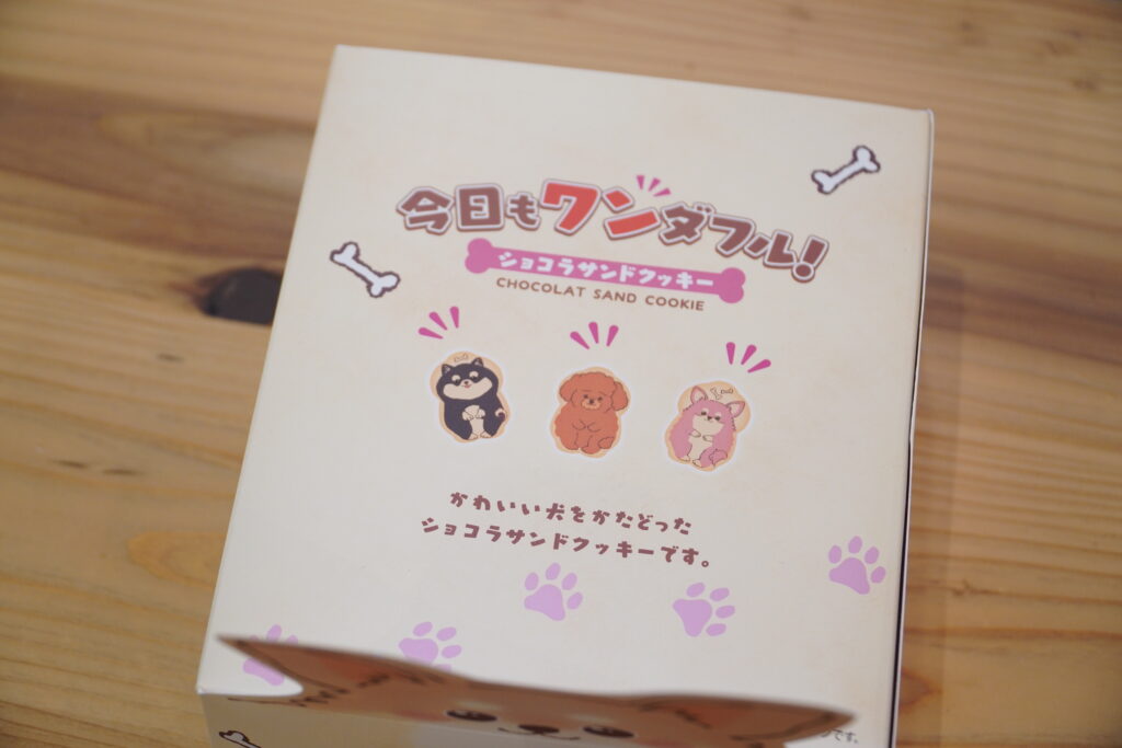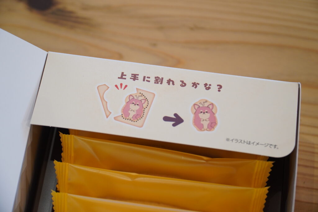 ふたを開けると「サッ」と犬がクッキーを持っているではありませんか。かわいい。そして上部には「上手に割れるかな?」の文字が。