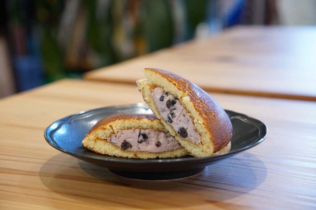 半分に切ってみると、細かく刻んだ桜の葉が入ったピンクのクリームがギュッと詰まっています。